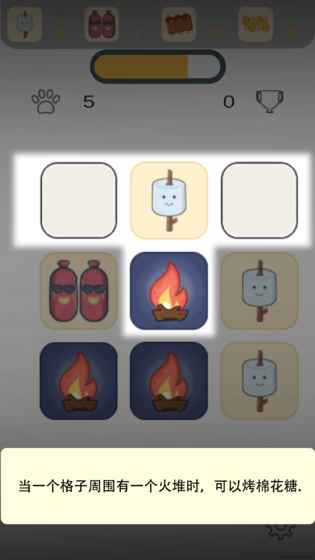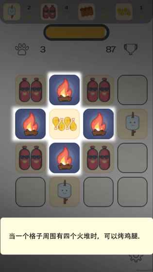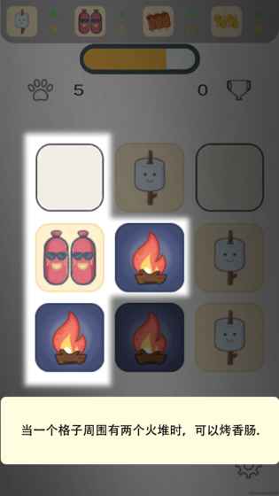 3、每种食物都有独特的烤制要求,需要玩家根据提示在相邻格子放置正确数量的火堆;
