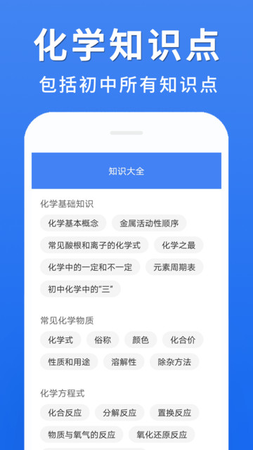 【化学知识大全】该功能包括了化学基本概念、元素周期表、化学式、俗称、颜色、化合价、化合反应、分解反应、置换反应等化学反应、化学实验的基本知识、操作知识和常见气体/离子的检验方法等内容。学生可以通过这一功能系统地学习化学知识,掌握化学实验的基本操作和注意事项,为中考打下坚实的基础。
