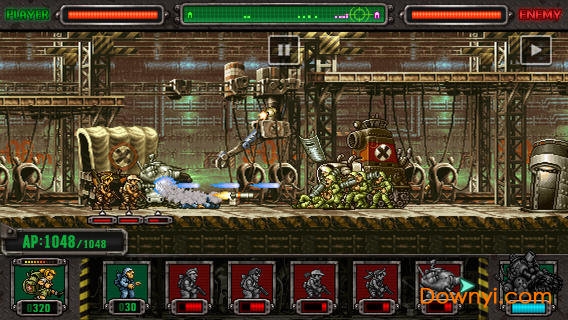 游戏采用横版卷轴式的塔防布局,玩家需要利用战场上的行动点数来召唤士兵。不同功能的士兵需要的点数各异,如何合理分配有限的点数资源成为制胜关键。每个兵种除了普通攻击外,还拥有独特的特殊技能,巧妙运用这些技能可以大幅提升作战效率。游戏地图设计丰富多样,玩家将在多个区域展开征战,遭遇各具特色的敌人。与动作射击版类似,每个地图最后都会迎来极具挑战性的BOSS战,这些BOSS都是合金弹头老玩家耳熟能详的角色。此外,关卡中还隐藏着需要营救的人质,成功解救所有人质将获得特殊奖励,为游戏增添了额外的探索乐趣。