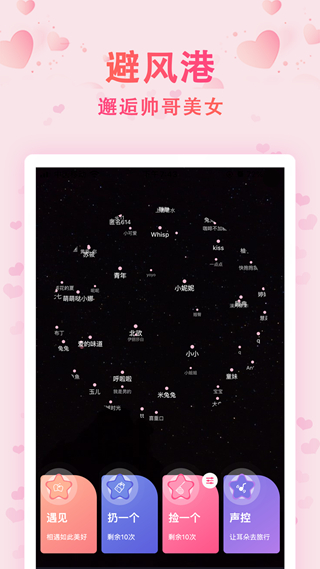 【避风港】这里汇集了随波逐流而来的漂流瓶,系统会快速匹配,总有一个瓶子与你有缘。无论是心情分享还是秘密倾诉,这里都能找到共鸣。