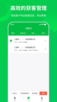 3、高效的获客管理:全网集客提供了强大的客户管理功能,用户可以根据需求筛选客户,并将数据导出到通讯录或表格中,方便后续的跟进和维护,进一步提升销售效率。