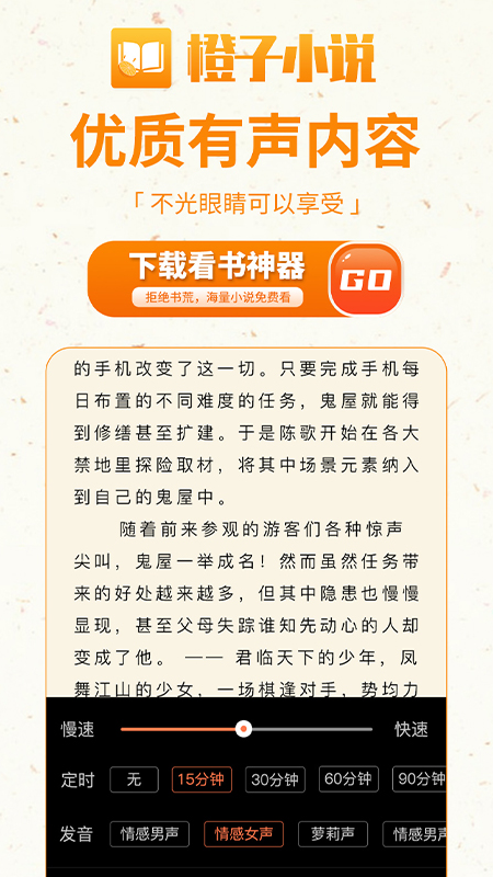 优质有声内容,橙子app不仅提供文字阅读,还拥有丰富的有声书资源。专业主播倾情演绎,让小说内容更加生动有趣。无论是通勤路上还是做家务时,都可以通过听书的方式享受阅读的乐趣,解放双眼,让阅读更加轻松便捷。