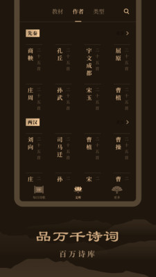 【精选文库】软件按照先秦两汉、魏晋南北朝、隋唐、五代、唐宋元明清等朝代编排,帮助用户快速找到对应朝代的诗人及其作品。此外,软件还按照人物、四季、抒情、节日等类型编排,方便用户快速定位到感兴趣的主题诗词。