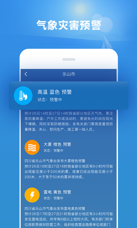 恶劣天气预警:通过智能推送系统,第一时间通知用户降雨、下雪、沙尘暴、雾霾等极端天气情况;