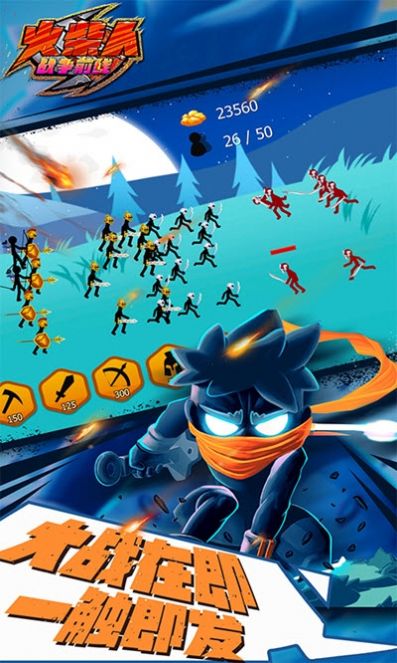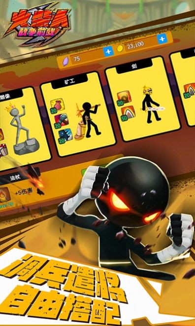 1:在一场场火柴人的斗争中赢取胜利,你需要将不同的近战单位,还有远程单位,进行合理的搭配,将他们的战斗潜能充分的发挥出来。合理的兵种搭配和战术安排是取得胜利的关键。
