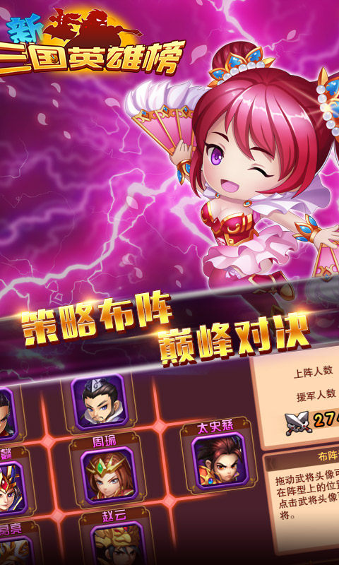 三国英雄榜修改版是一款以三国时代为背景的Q版角色扮演游戏,经过精心修改后带来更畅快的游戏体验。在这款游戏中,玩家将收集上百位造型可爱的三国名将,组建属于自己的最强军团。游戏采用经典的回合制战斗模式,融合了武将缘分、技能克制、属性相克等深度策略玩法,同时加入了轻松挂机系统,让玩家即使离线也能获得丰厚奖励。无论是喜欢策略战斗还是休闲养成的玩家,都能在这里找到乐趣。游戏还特别准备了海量福利活动,包括VIP特权、元宝赠送、稀有武将等,助你快速成长,征战三国!