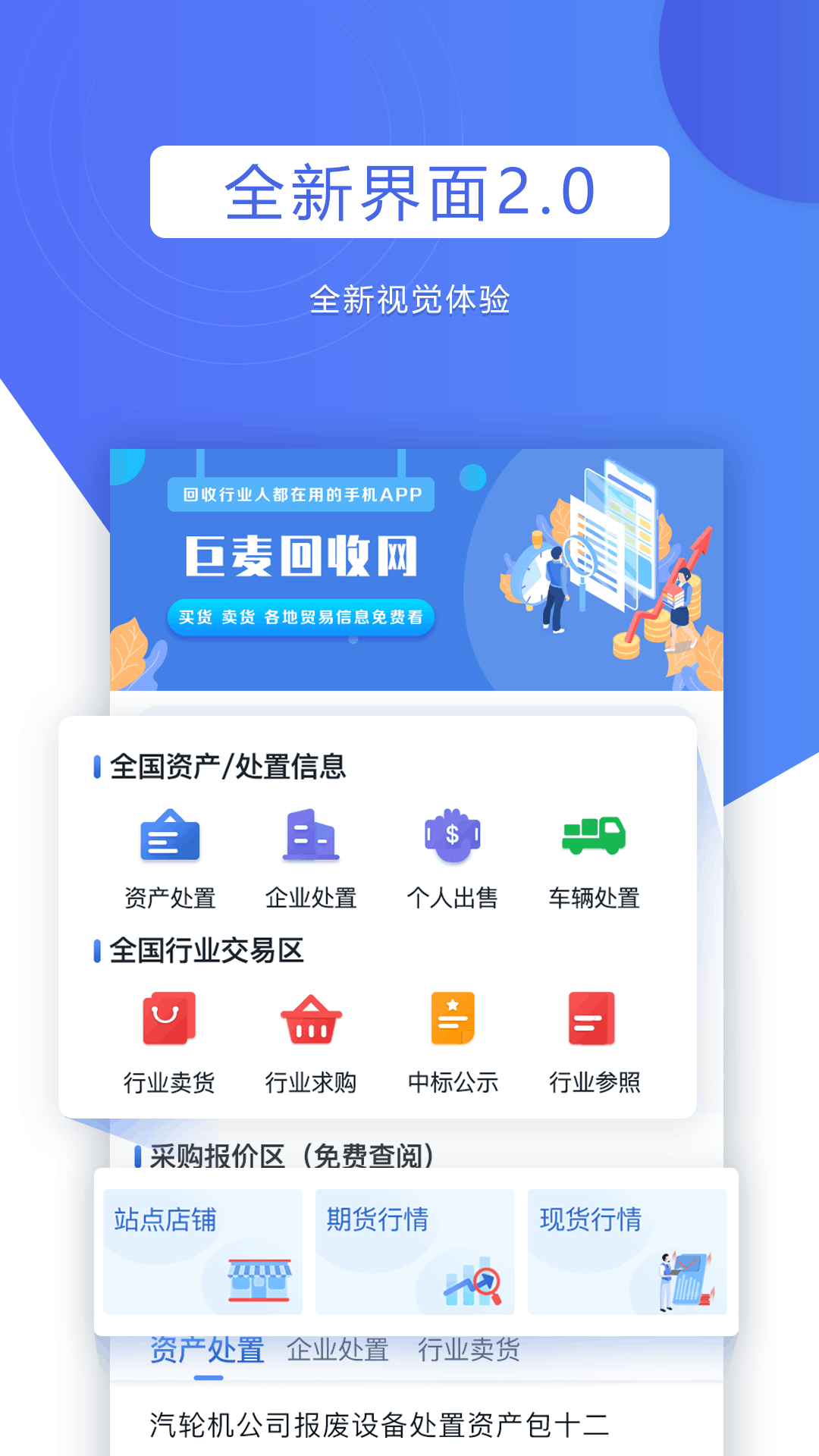 巨麦回收网app是一款专注于全国工厂企业物资回收的智能信息平台,致力于为用户提供高效便捷的回收服务。通过该平台,用户可以实时查看行业公告和最新报价信息,轻松获取同行买卖资源,实现资产快速变现。线上站点功能让您的回收需求广而告之,吸引更多优质货源,同时配备专业在线客服团队,一对一解决交易难题,确保买卖无忧。无论您是废品回收商还是企业物资处置方,巨麦回收网都能为您提供一站式解决方案,助您轻松拓展业务,提升收益。