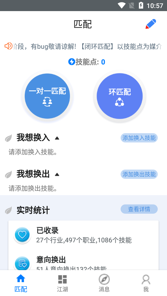 1.在首页实时统计中新增了点击查看所有换入技能和换出技能列表的功能,方便用户快速浏览和管理自己的技能交换情况。2.修复了消息页面的一些bug,提升了用户体验,确保用户在使用过程中更加顺畅。