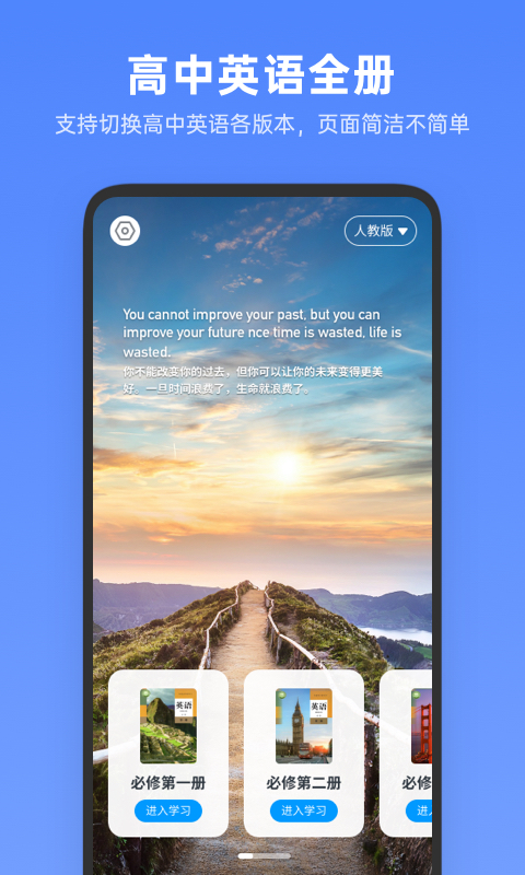 这款高中英语课本同步点读软件是一款专为高中生打造的英语学习工具,能够帮助用户高效学习英语。软件与各版本高中英语教材完全同步,提供课文和单词的精准翻译,让学习更加轻松便捷。无论是预习、复习还是课后巩固,都能满足不同学习需求。通过丰富的功能和简洁美观的界面设计,软件致力于为用户提供优质的学习体验,让英语学习变得更加高效有趣。