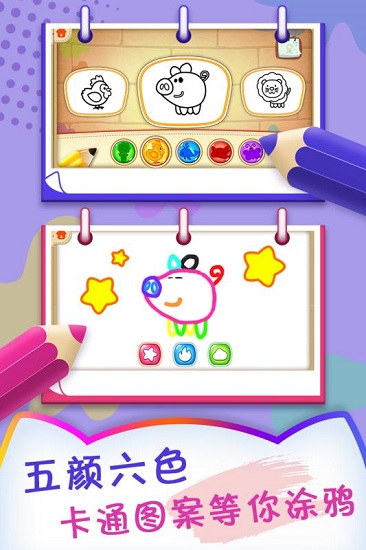 1、游戏采用明亮活泼的卡通画风,色彩鲜艳而不刺眼,非常适合小朋友的视觉特点。在这样的画面环境中,孩子们可以尽情释放想象力,创作出充满童趣的绘画作品;