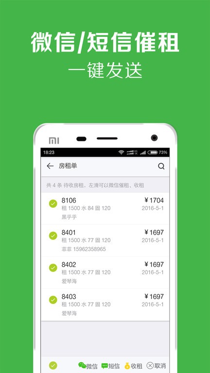 5、【微信催租】系统深度整合微信生态,房东可以直接通过微信向租客发送房租单。租客关注"租房管理"公众号后,无需添加好友即可接收各类通知。系统支持批量发送功能,可以一次性给多位租客发送提醒,大大提升了催缴效率。