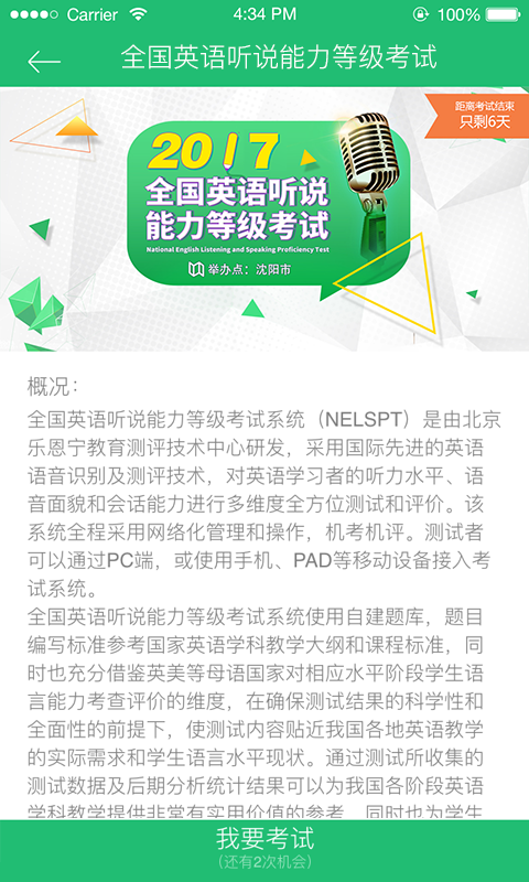 2、通过应用选择考试,报名考试,然后进入考试答题,完成答题后提交成绩,等待成绩报告。考试过程支持语音识别和智能评分,确保评测结果准确可靠;