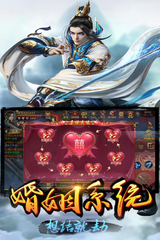 2、社交系统自由开放,玩家可以结交好友、寻找情缘,与道侣结伴闯荡双修副本。万人同屏竞技厮杀,热血沸腾的激战与对战,让玩家亲身演绎各种神话剧情,体验最真实的仙侠社交;