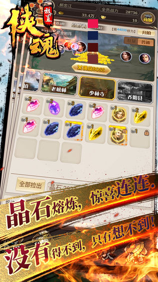 游戏中收集的各种晶石可以通过熔炼系统转化为珍稀道具。每次熔炼都可能获得意想不到的稀有物品,从强化材料到特殊装备应有尽有。丰富的随机性让每次熔炼都充满期待,为玩家的江湖之旅增添更多变数与乐趣。