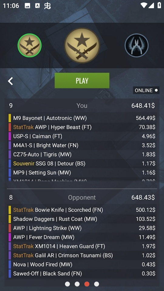 3、市场:购买所需品质的任何武器或刀!您可以使用按名称搜索皮肤或在五个武器类别中浏览皮肤。市场采用动态价格机制,热门物品价格会随供需关系波动,增加了交易的策略性。