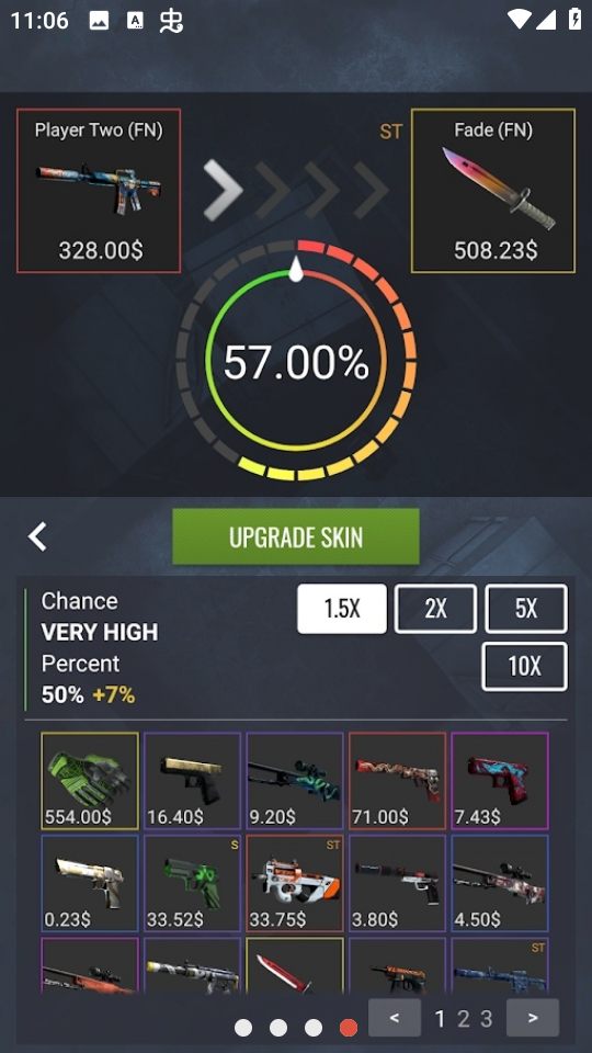 6、升级器:将皮肤升级到原始值的10倍。如果成功,您将赢得新的皮肤;否则,您将失去原来的皮肤!升级系统提供多种升级方案,玩家可以根据风险偏好选择不同倍率的升级方式。