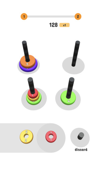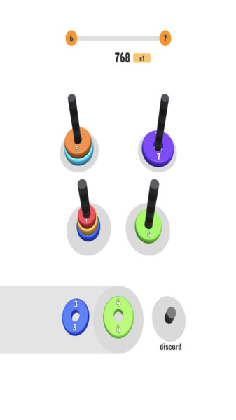 休闲益智类游戏,玩家动手拖动3D圆环放置在合适的柱子上,相同颜色、数字的两个圆环可以合并进化,得到的数字变大沉淀在最后,注意套圈的顺序才能精准计算数字,不断消除圈圈成功过关。