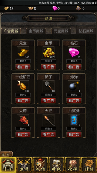 4、游戏商城提供多种获取资源的途径,除了常规充值外,玩家还可以通过观看广告视频免费领取大量资源。这些资源包括经验药水、强化材料、稀有装备等,合理使用能显著加快成长速度,让平民玩家也能享受游戏乐趣。