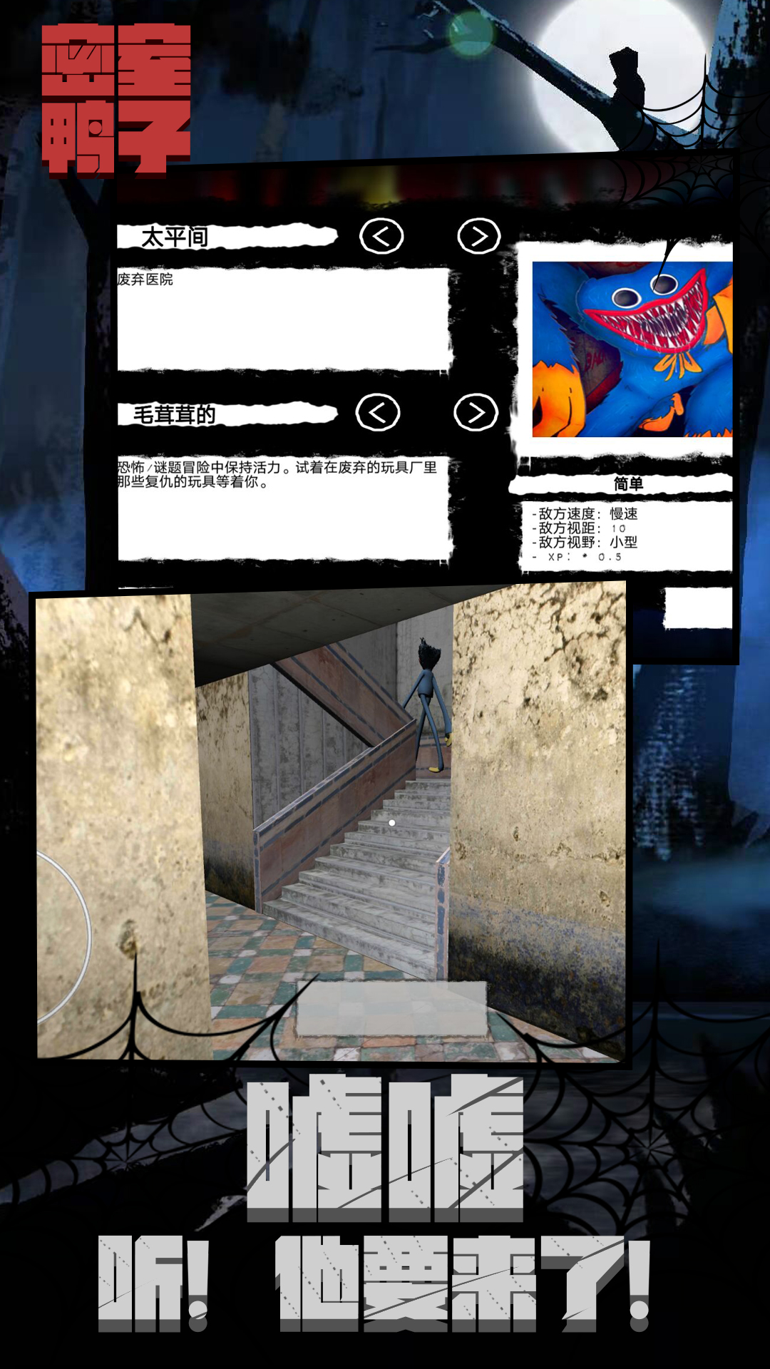 密室鸭子是一款惊悚恐怖、冒险类游戏,其画面还原度极高,黑暗的画风与阴气沉沉的背景音乐完美结合,营造出令人窒息的氛围。玩家将以第一视角操控角色,从医院的停尸房醒来,发现自己被困在一个充满未知危险的密室中。游戏中,你需要保持冷静,利用环境中的物品和线索寻找逃生之路,同时还要躲避身后不为人知的怪物。每一步都充满紧张与恐惧,稍有不慎就会被怪物抓住。游戏的沉浸感极强,玩家仿佛置身于真实的恐怖场景中,每一个细节都让人毛骨悚然。如果你喜欢挑战自我,享受心跳加速的感觉,密室鸭子绝对值得一试。