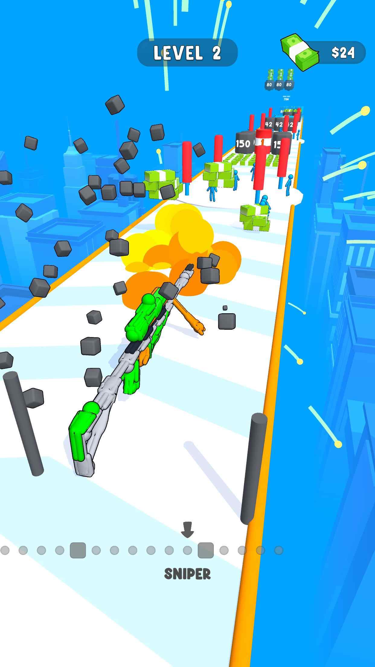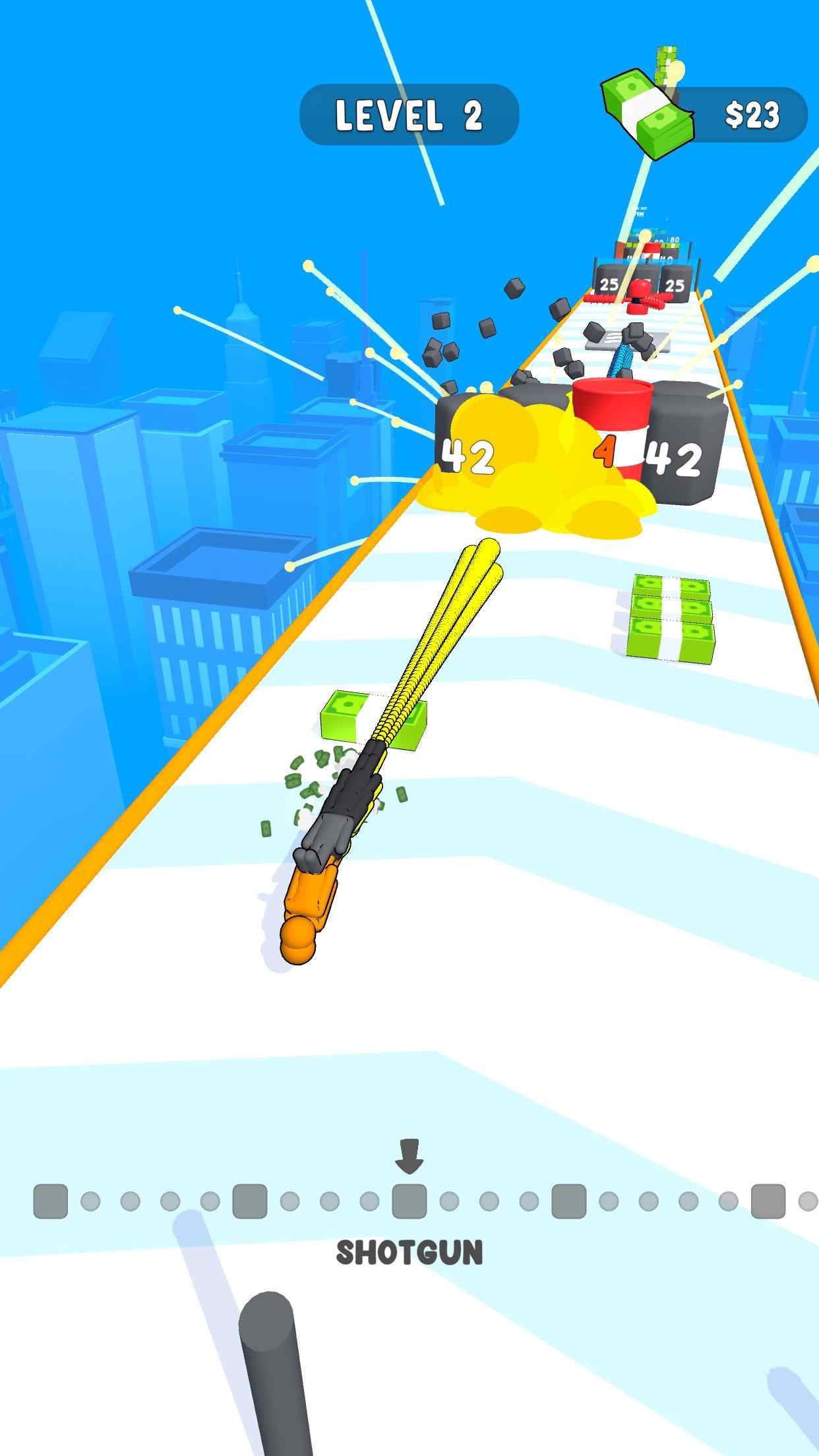 游戏提供了多样化的趣味玩法,玩家可以在跑酷过程中收集各种特殊子弹,并使用背后的武器攻击砖块等障碍物。摧毁这些障碍物后,玩家有机会获得更强大的武器,为后续关卡做好准备。在游戏的最后阶段,系统会根据玩家的表现进行评分,考验玩家的综合实力。游戏将跑酷与射击元素完美融合,玩家可以手持绿色机枪疯狂射击,清除面前的所有障碍。这种独特的玩法设计让游戏过程充满刺激与乐趣,给玩家带来全新的游戏体验。