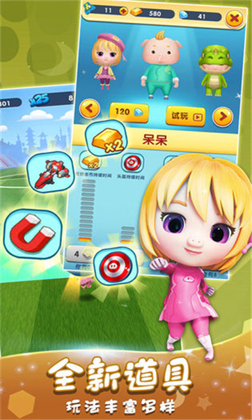 3. 游戏中有多个角色可供选择,包括猪猪侠、菲菲等,还有各种恐龙装、海盗装等外观皮肤,玩家可以自由切换,打造个性化的跑酷体验。