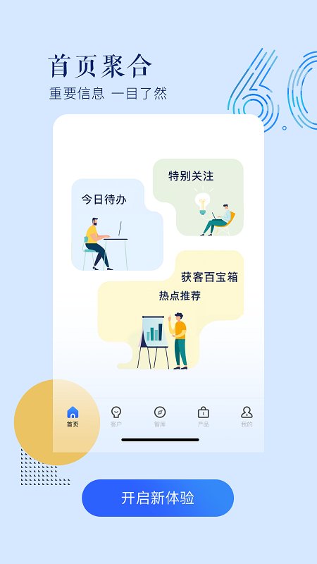 v6.0.0版本完成核心功能模块重构,全新设计的首页聚合关键业务数据;获客百宝箱整合20+实用工具;产品库新增公募基金专区,满足多样化配置需求。