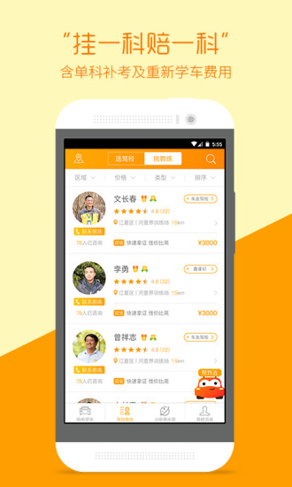 2、学车保障:”吃拿卡要”先行赔付、考试不过包赔、专业学车顾问全程跟踪等等7大保障体系为您全程排忧解难。首创"不满意就退款"承诺,如果教练存在违规行为,平台将先行赔付学员损失。每位学员都配有专属学车顾问,从报名到拿证提供一对一服务,及时解决各种学车难题。