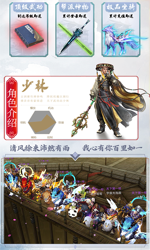 1、游戏采用精美华丽的特效制作,每一招每一式都充满视觉冲击力;2、恢宏的仙侠世界观设定,让玩家沉浸在这个充满东方韵味的奇幻世界;3、3D游戏引擎打造流畅的战斗体验,技能释放行云流水;4、野外自由PK系统让玩家可以随时展开热血对决;5、完善的社交系统支持玩家与兄弟好友组队冒险,与心爱之人共闯天涯。游戏还特别设计了多种互动玩法,让玩家在修仙路上不再孤单。
