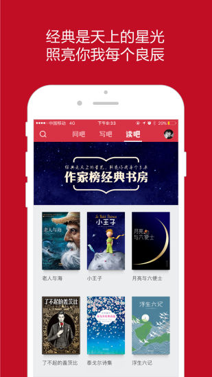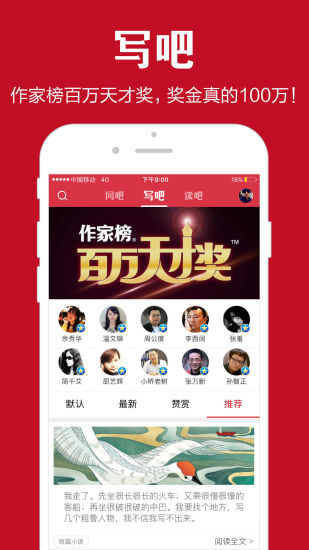 1、万众瞩目的"作家榜APP"震撼上线,平台推出的百万天才奖评选活动引发全网热议。在这里,您可以通过"读吧"品味经典,在"问吧"与大咖对话,在"写吧"展现才华。平台还特别设置了创作导师制度,由知名作家亲自指导优秀创作者,助力文学新星成长。
