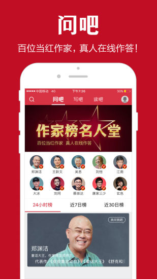 2、进入APP后,向左滑动屏幕即可看到"问吧"入口,点击心仪作家的头像进入其主页;