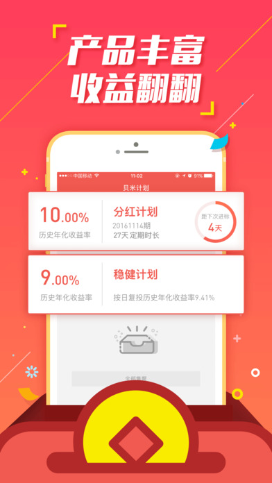贝米钱包APP安卓版是一款专为个人理财打造的智能金融服务平台,以"安全、便捷、高收益"为核心特色。平台采用银行级风控体系,提供100%本息保障机制,并设立5000万风险备用金为用户资金安全保驾护航。起投门槛仅需100元,支持T+0实时赎回功能,收益率远超银行活期存款。独创的分红收益模块让用户在享受余额宝式便捷操作的同时,还能获得额外收益分红。目前提供定存计划、分红计划、稳健计划三款理财产品,满足不同风险偏好用户的投资需求。