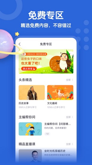 「学习方法」板块由知识高手亲授高效学习法,优化思维模式,提升各项技能。「拓展阅读」精选优质有声读物,帮助孩子利用碎片时间开拓视野。「舰长广播」每天分享新鲜资讯和课程精华。「超越课堂」由特级教师团队打造,覆盖中小学各学科知识点和考试重点,解答考试命题,满足升学需求。这些内容既注重知识传授,又强调能力培养,让孩子在轻松愉快的氛围中获得全面发展。