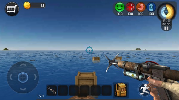 2、海上有各种资源,对准目标,长按右侧射击按钮,将物品拉回来;收集资源时要讲究策略,优先获取食物和饮用水。注意有些漂浮物可能被鲨鱼环绕,需要等待安全时机再出手。