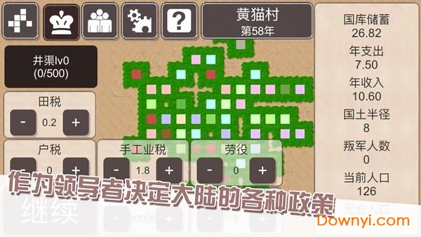 本作创新性地将田园生活与国家治理相结合,为玩家带来前所未有的模拟体验。您将化身这片土地的绝对统治者,不仅要规划农田种植与家族延续,更要统筹国家发展的方方面面。从决定年度征兵规模到调整各类税赋比例,从规划大型基建项目到平衡民生需求,每个选择都将影响王朝兴衰。游戏采用直观的触控操作,配合详尽的政策系统,让治国理政变得既轻松又富有策略深度。