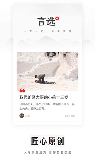 2.言选频道全新改版,一言一行都皆具甄选。优化后的界面更加清爽,内容分类更加细致,精选优质言论,展现思想魅力。
