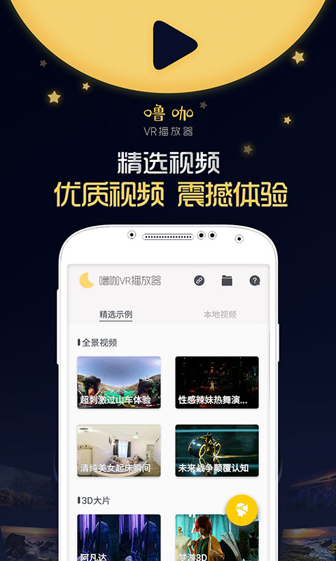 Airplay功能让您轻松实现电脑视频一键导入移动设备,即使是4K大文件也能流畅传输,完全摆脱数据线的束缚。精选视频专区持续更新高品质内容,为您带来震撼的视觉享受。本地视频管理功能智能检索手机存储,新下载的视频即刻可见。全面兼容市面上主流VR设备,包括Cardboard、小米VR、暴风魔镜等多款产品,确保每位用户都能获得最佳的VR观影体验。