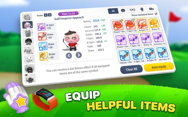 1、游戏中您可以与憨厚可爱的KakaoFriends小动物伙伴们一起打高尔夫,每个角色都拥有独特的球杆专长和个性特点。通过收集不同角色,您可以组建一支8人团队,体验多样化的高尔夫玩法。2、游戏支持全球联网对战,您可以与世界各地的高尔夫爱好者同场竞技,展现您的球技。同时游戏还提供丰富的单人挑战模式,让玩家可以随时练习提升技术水平。3、游戏内设有完善的装备收集系统,包含各种球具、球杆等专业装备,合理搭配装备将显著提升您的比赛表现。通过不断收集和升级装备,打造属于您的专属高尔夫装备库。
