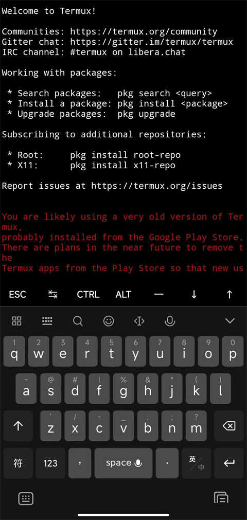 安装好后,可以看到以下的界面,这是一个模拟终端,并不能运行Linux环境下的二进制程序。但是Termux下可以安装proot-distro,这个软件可以在Termux存储空间内部署一个真正的Linux环境。