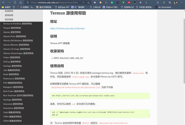 在安装proot-distro之前,我们先换源,这样之后的速度会比较快。(默认连接的国际站点,国内太慢)这里推荐使用中科大的源。