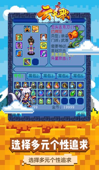 《云中歌》是一款采用经典像素风格打造的放置挂机类修仙手游。游戏画面简洁大方,没有过多花哨的特效,但通过精致的像素艺术呈现出了独特的视觉美感。游戏还原了最纯粹的修仙体验,让玩家能够重温经典游戏的乐趣。在这个熟悉的修仙世界中,玩家可以选择加入心仪的门派,开启属于自己的修仙之旅。随着游戏的深入,玩家将逐步提升实力,最终成为仙界的主宰者,体验从凡人到仙人的完整成长过程。