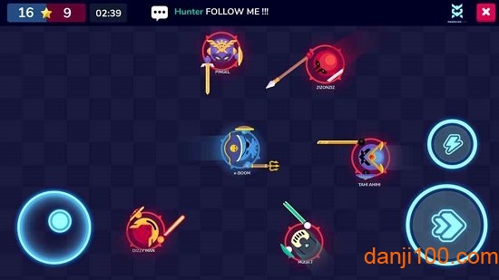1.游戏玩法与目前流行的大作战系列非常相似,我们用左下角的摇杆进行走位控制,通过控制前行方向用武器去攻击敌人。不过大家要注意一点,只能用武器撞到对方,才会让对手死亡,如果是旁边身体碰到对手是没有效果的。游戏还加入了地形障碍物系统,合理利用环境可以创造战术优势。