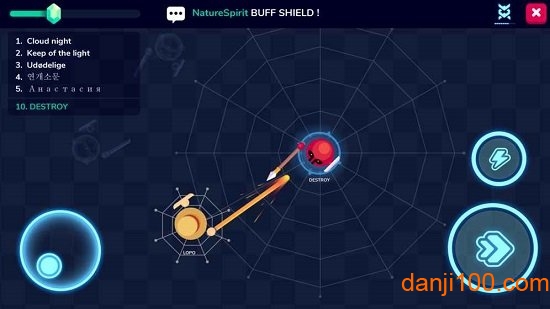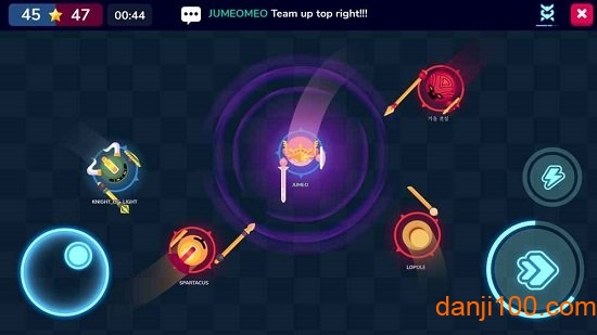 2.除了用摇杆控制角色走位之外,在屏幕右下角还有一个"加速"按钮,点击可以让角色加速前行,不过加速会消耗能量,能量消耗完后就只能等待cd回满了。收集这些能量水晶后,我们角色的武器会变长,正所谓一寸长一寸强,武器越长,我们在对战中就越有优势。游戏还加入了特殊道具系统,随机刷新的道具可以带来意想不到的战斗效果。
