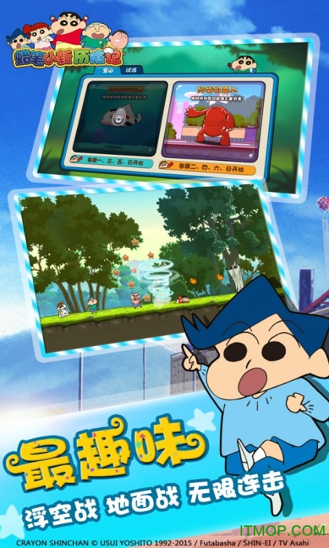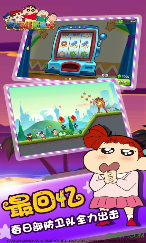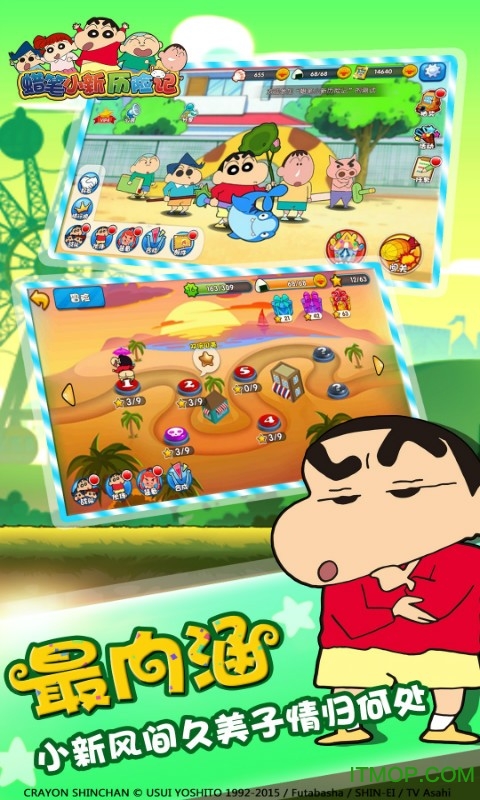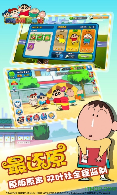 《蜡笔小新历险记》是一款获得日本双叶社官方授权的休闲益智RPG手游,完美融合了物理抛射和角色养成两大核心玩法。游戏忠实还原了动画中的经典场景和人物形象,让玩家在重温童年回忆的同时体验全新的冒险故事。从春日部市到动感超人世界,游戏场景丰富多彩,剧情幽默风趣。玩家将跟随小新、风间、妮妮等熟悉的小伙伴们一起展开奇妙旅程,挑战各种趣味关卡,体验原汁原味的蜡笔小新世界。