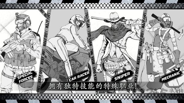 游戏提供四种基础职业选择:特种兵、狙击手、赛车手和技师,每种职业都有独特的技能树和发展路线。玩家可以通过八种不同的转职系统进一步强化角色能力,自由切换职业发展方向。十二种核心技能可以自由搭配组合,根据战场情况制定最佳战术方案。游戏地图设计精巧,玩家需要探索城市各个区域,搜集武器装备和生存物资。战斗系统极具深度,装备优劣直接影响战斗结果,需要不断升级装备才能立于不败之地。独特的文字对战模式将传统射击游戏的紧张感转化为策略思考,不需要精准的枪法,而是依靠智慧取胜。游戏还加入了车辆系统,玩家可以驾驶不同车辆快速移动或逃离危险。体力管理系统增加了生存压力,需要合理使用医疗物资保持最佳状态。职业特性技能的使用时机往往能决定战斗胜负,需要玩家熟练掌握。游戏画面风格独树一帜,黑白配色搭配文字描述,创造出前所未有的沉浸式体验。