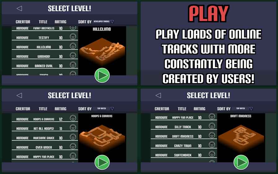 2、玩家可以自由设计疯狂赛道,不仅能挑战自我极限,还能将创意作品分享给全球玩家;