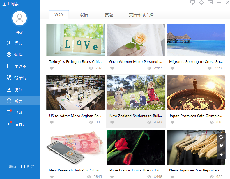 【听力训练】金山词霸内置了丰富的听力资源,用户可以通过听力训练功能提高听力水平,建议每天进行一定时间的听力练习。