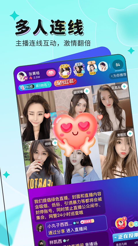 1.PK升级,趣味无穷:映客直播APP创新性地推出了多维度PK玩法,包括才艺比拼、知识竞赛、互动游戏等多种形式。主播可以通过PK展示实力、积累人气,观众则能参与投票、打赏等互动环节,共同决定比赛结果。这种竞技模式不仅增加了直播的观赏性,还创造了更多互动机会,让直播过程更加精彩纷呈。