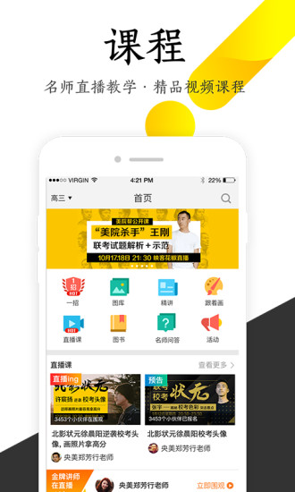 名师云集:平台汇聚了300+位一线美术名师,包括省级美术特级教师、美院教授等,用户可通过直播、私信等多种方式与名师直接交流。