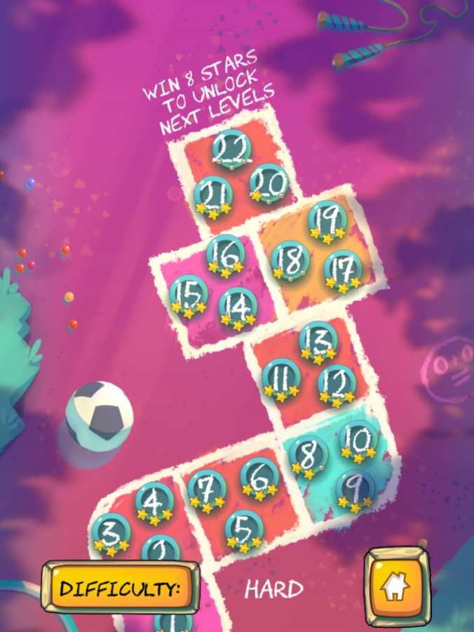 游戏提供了丰富多样的玩法内容:29个精心设计的关卡,从简单到困难循序渐进,满足不同水平玩家的需求;每个关卡都有独特的格子设计,需要玩家采用不同的跳跃策略和技巧来应对;特别贴心的"婴儿"模式让新手玩家也能轻松上手,享受游戏乐趣。游戏画面采用明亮活泼的彩绘风格,完美还原了童年跳房子的欢乐氛围。随着游戏进程,玩家还能解锁各种有趣的角色皮肤和特效,为游戏增添更多个性化元素。音乐音效方面也经过精心设计,带来沉浸式的游戏体验。