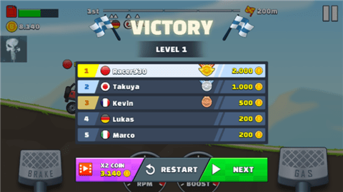 1、游戏采用真实物理引擎,玩家需要综合考虑车辆的重力、速度、转向和弹跳等物理特性,才能顺利完成挑战。
